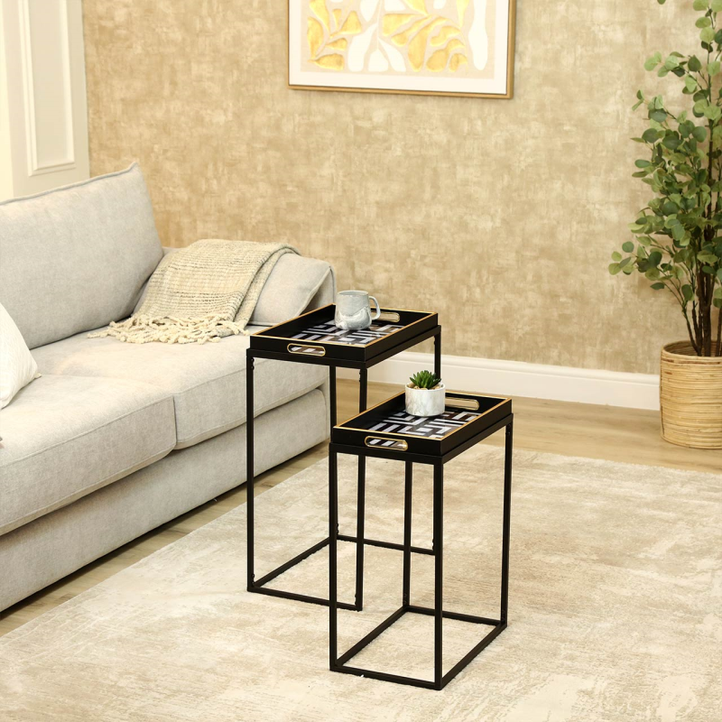 Add contemporary flair and versatile function to your living space with this striking nest of tray tables. Featuring a bold black-and-white geometric design, each table combines a sleek black metal frame with a removable tray top edged in elegant gold detailing. Perfect for entertaining or everyday use, these tables work beautifully as side tables, accent pieces, or stylish serving stations.