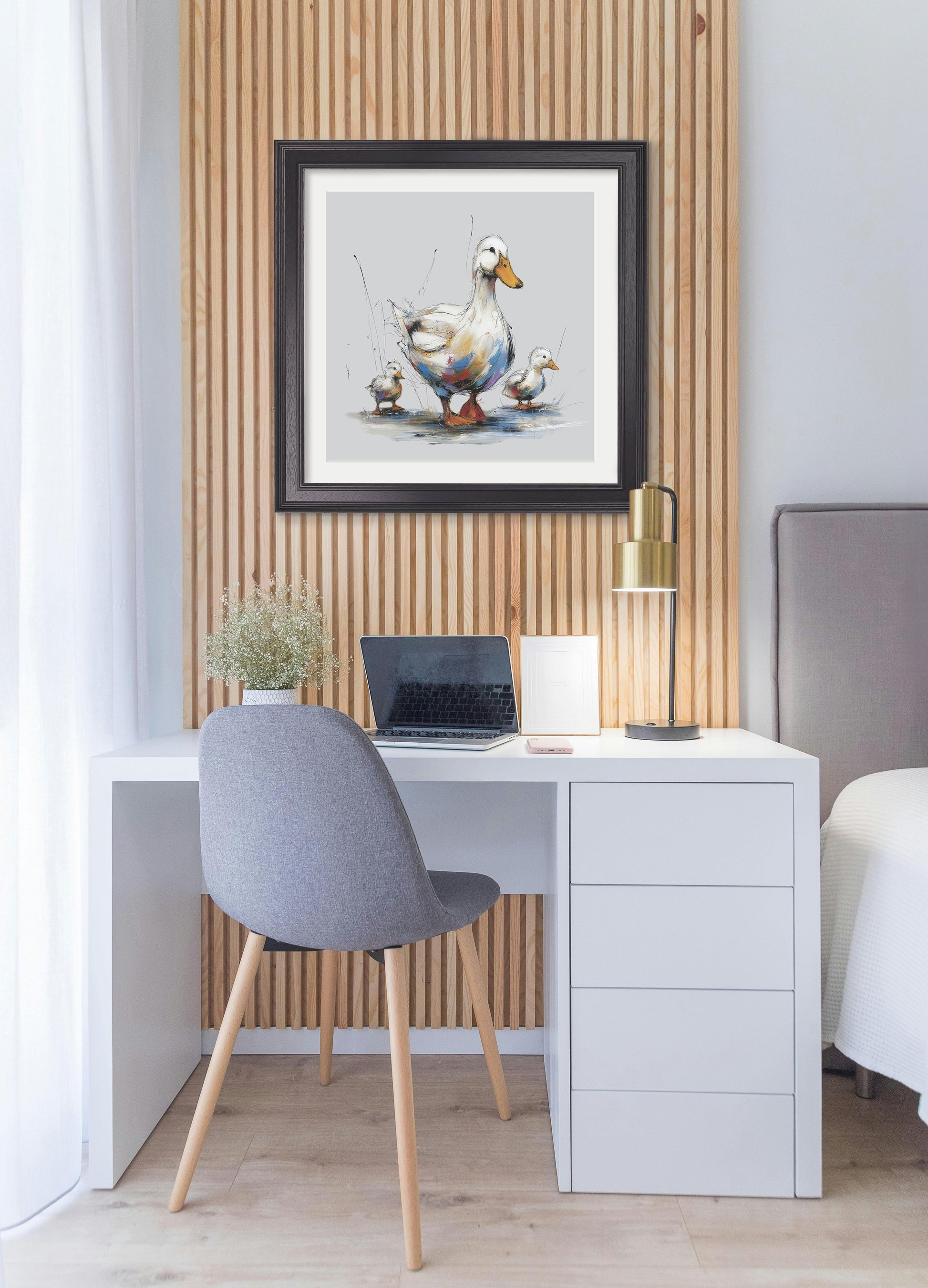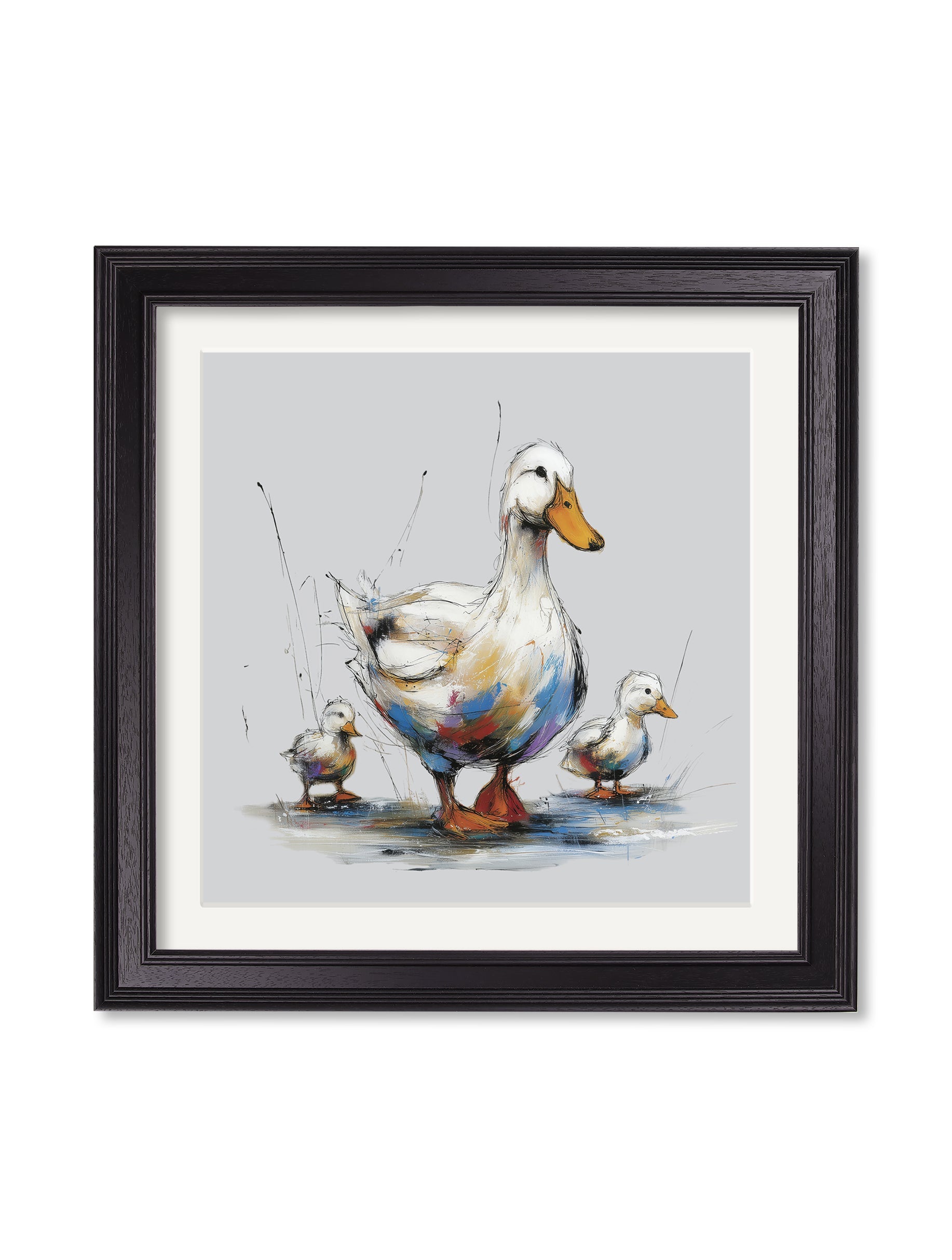 This delightful print brings a touch of warmth and whimsy to your walls, featuring a Family of Ducks captured in a playful, expressive style. Full of character, the design showcases fine sketch and brushstroke details that highlight their cute expressions and charming personalities. The soft, textured tones create a cosy, heartwarming focal point that brightens any space. Set against a pale grey background and finished in our square Black Hurstwood frame with mount, this print stands beautifully on its own or as part of our animal cosy sketch collection.