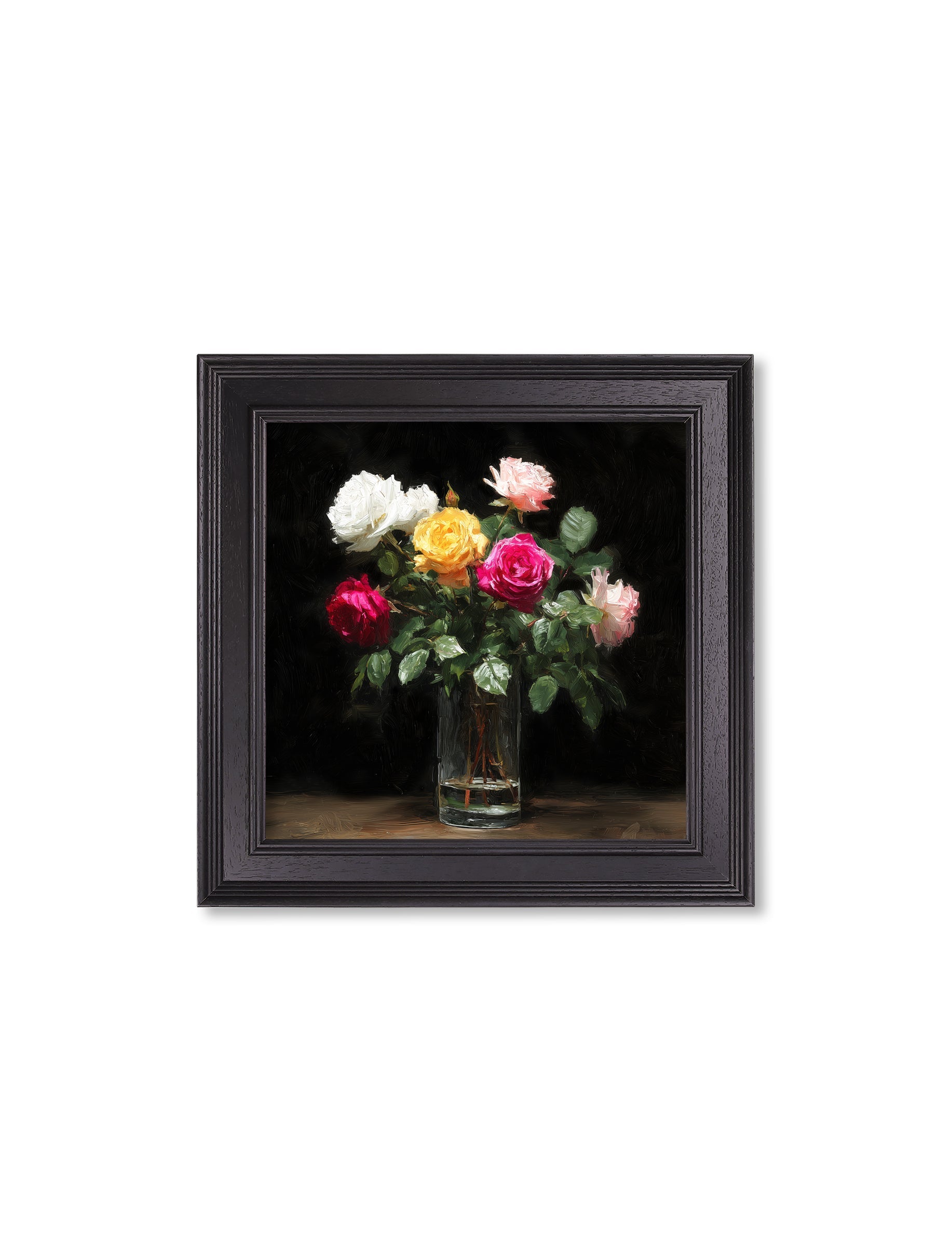 This romantic print from our After Dark collection showcases a lush arrangement of roses in full bloom, gathered in a clear glass vase and set against a deep black backdrop. Rich crimson, soft blush, creamy white and golden tones intertwine, forming a layered bouquet full of depth and natural beauty. Palette-knife textures give each petal a soft, dimensional finish, while the leafy greens bring balance and gentle movement. Finished in our square Black Hurstwood frame, this print pairs effortlessly with the other After Dark series for a cohesive wall display full of richness, texture and timeless floral drama.