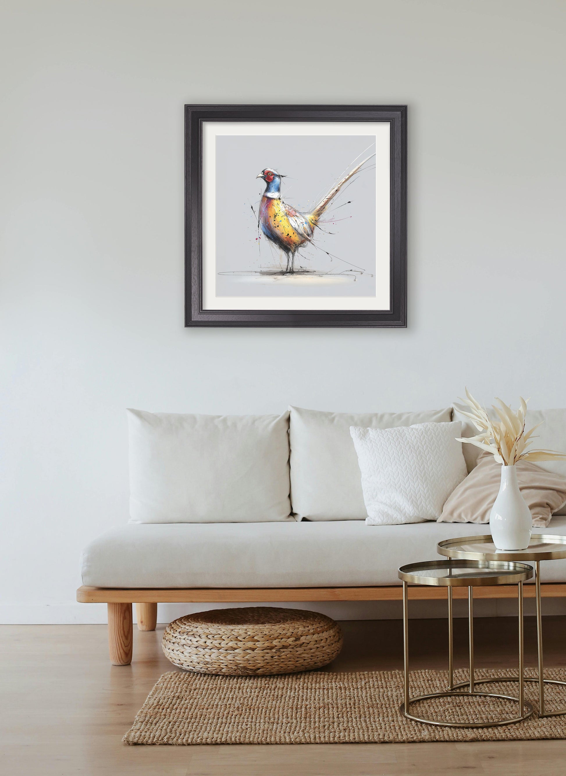 This charming print features a Plump Pheasant, full of character and personality. The sketch and brushstroke details capture its graceful feathers and curious, expressive gaze. The soft tones and balanced composition create a cosy, uplifting focal point for any room. Set against a pale grey background and finished in our square Black Hurstwood frame with mount, this print works beautifully on its own or as part of our animal cosy sketch collection.