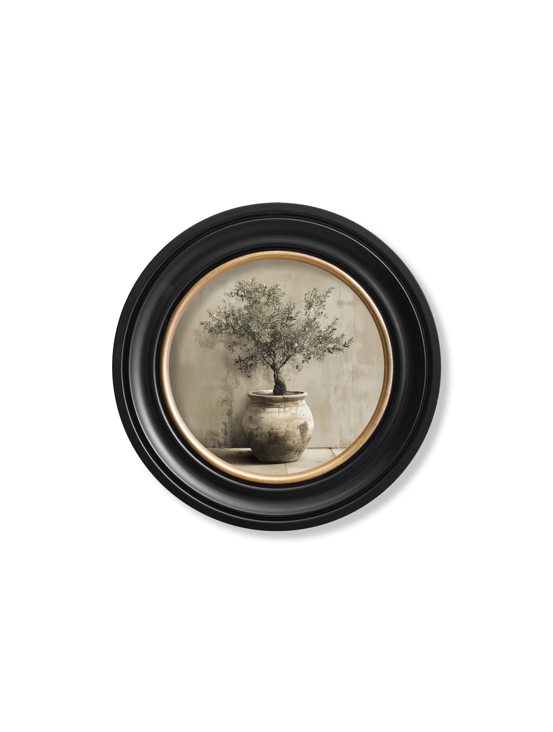This calming print features a graceful olive tree rising from a weathered stone pot. Blending rustic Mediterranean charm with soft textures and muted brushwork to bring depth to the silvery-green foliage and aged ceramic pot. The distressed plaster-style background adds warmth, character and a sense of history. Finished in our signature round Oxford Black and Gold frame. The soothing palette of muted neutrals, soft sage and chalky stone creates a relaxed yet refined focal point, perfect for bringing a sense of calm and natural beauty to any space.