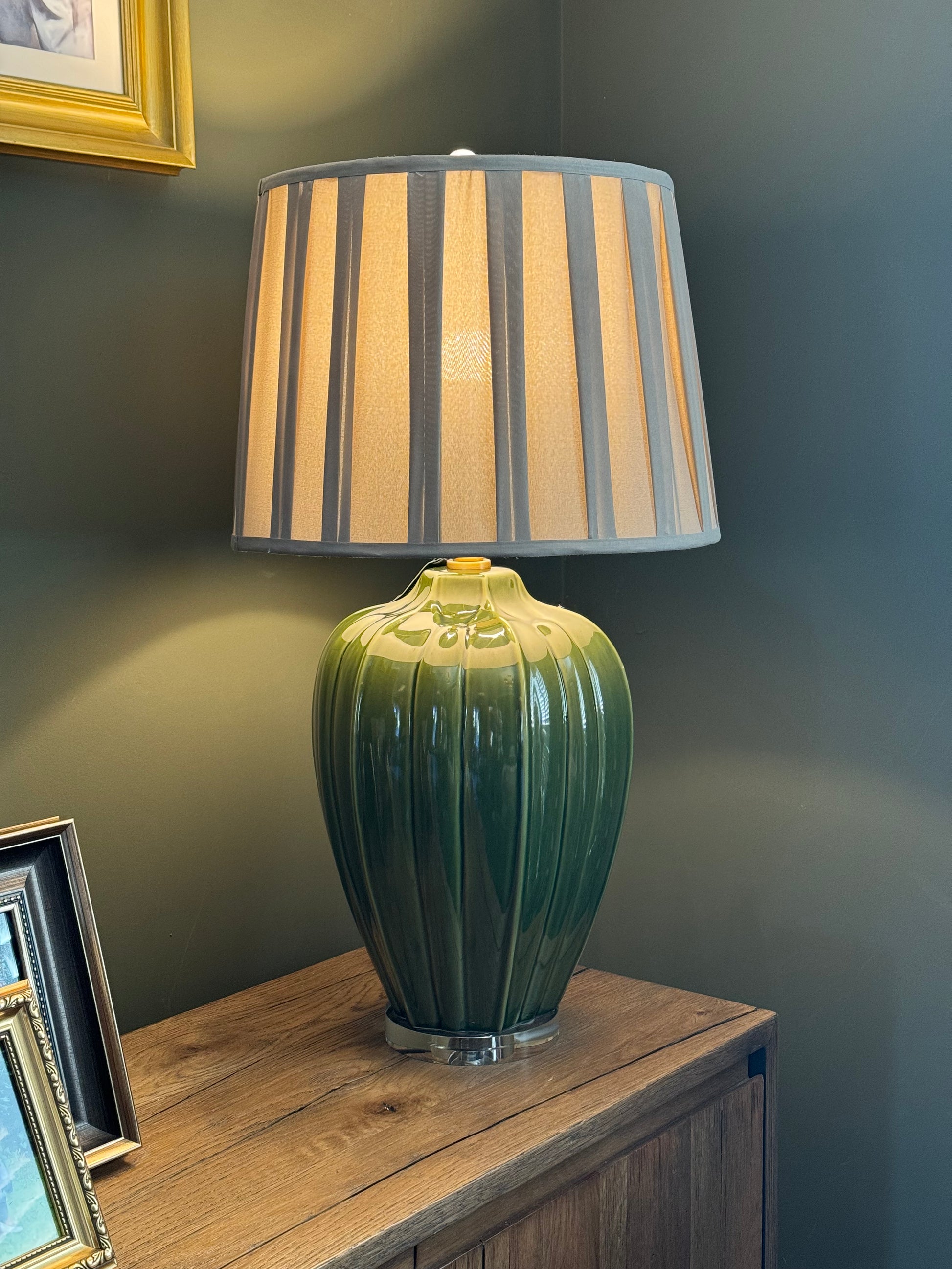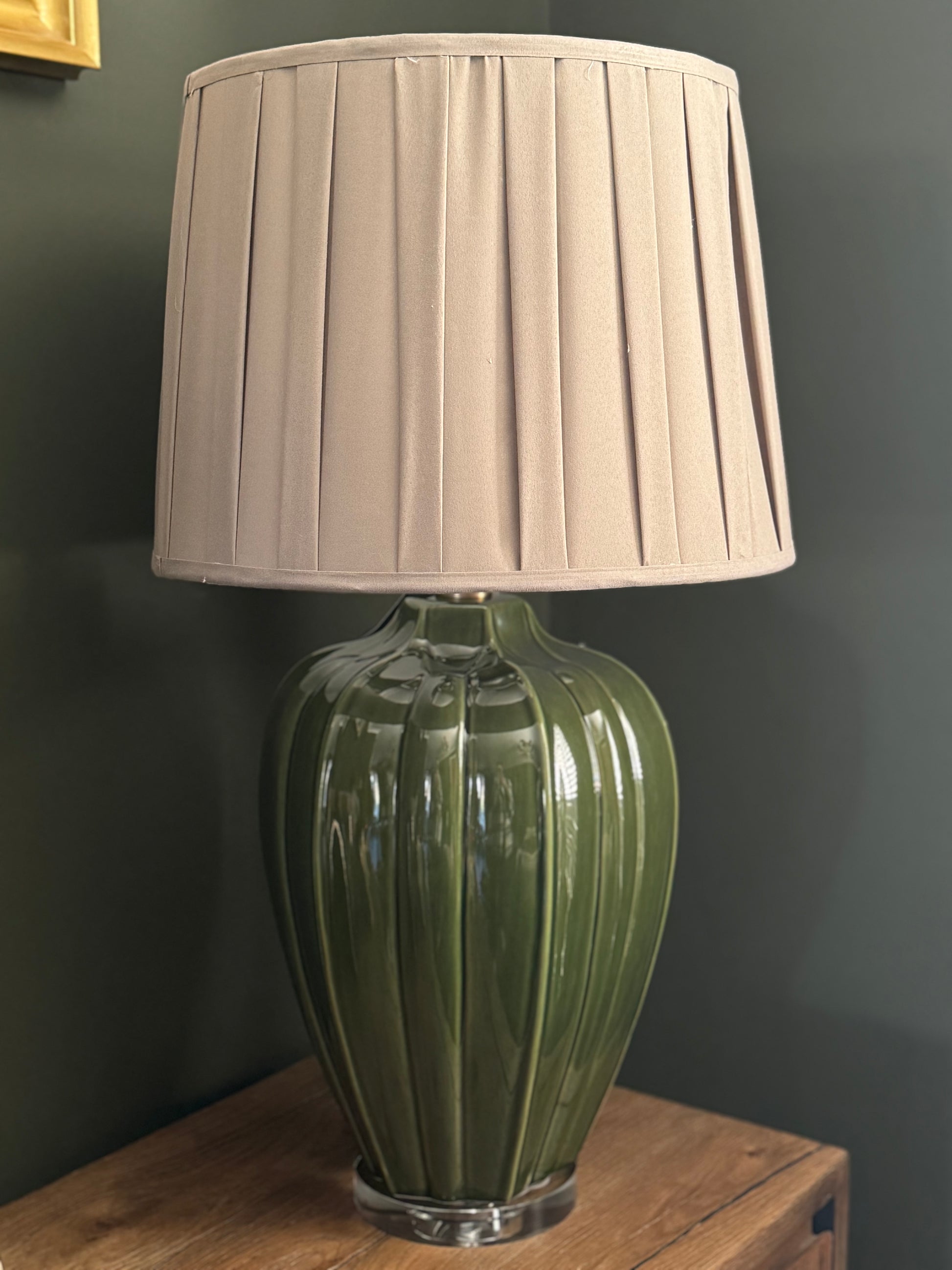Illuminate your space with the stunning Astrid Green Table Lamp. The beautiful green base, accented with a crystal bottom, adds a touch of luxury to any room. The pleated taupe shade exudes sophistication and complements the elegant design. Elevate your decor with this stylish and tasteful lamp
