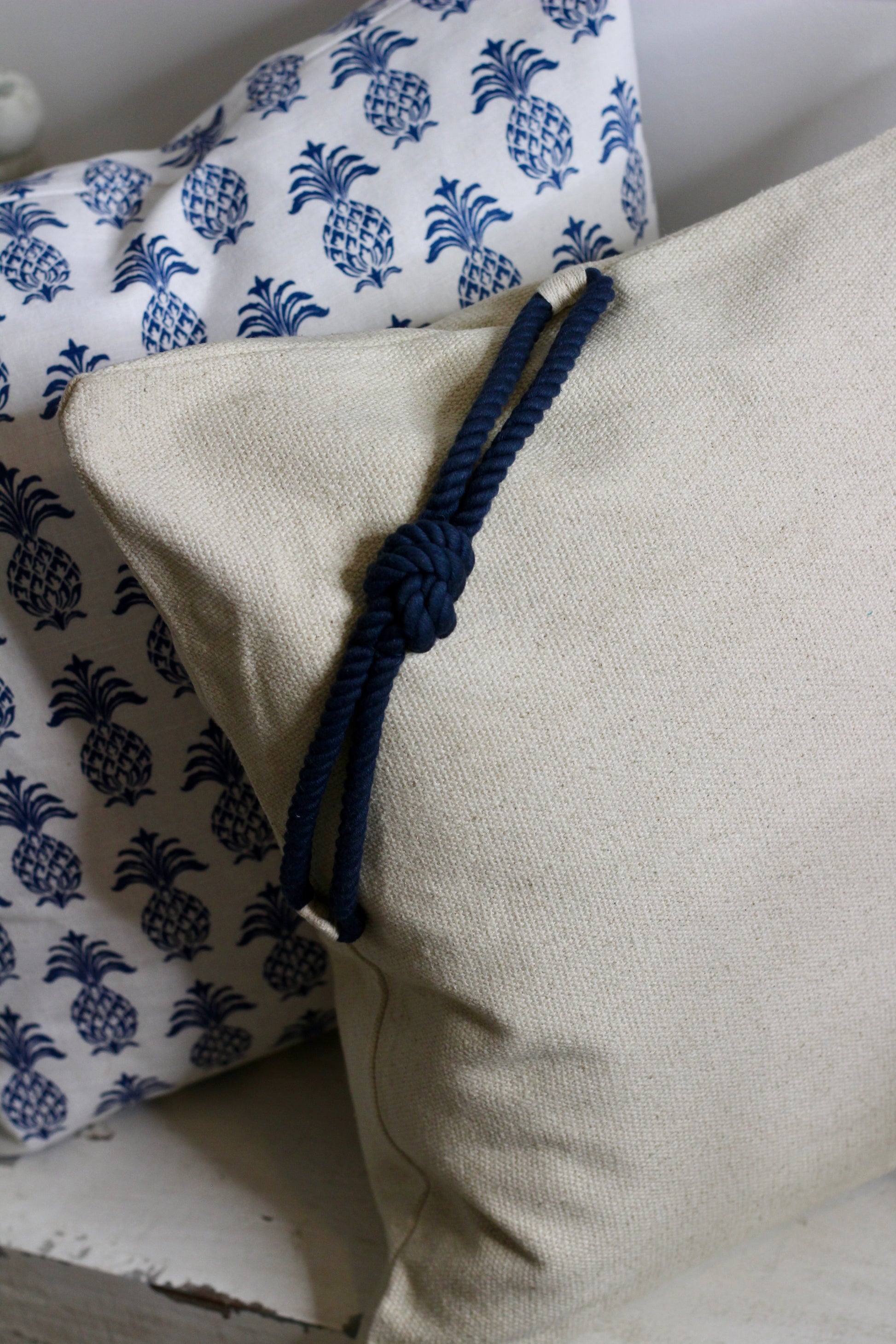 Add a nautical twist to your home with this charming rope cushion. The cushion comes in a linen colour with a navy knotted twist.