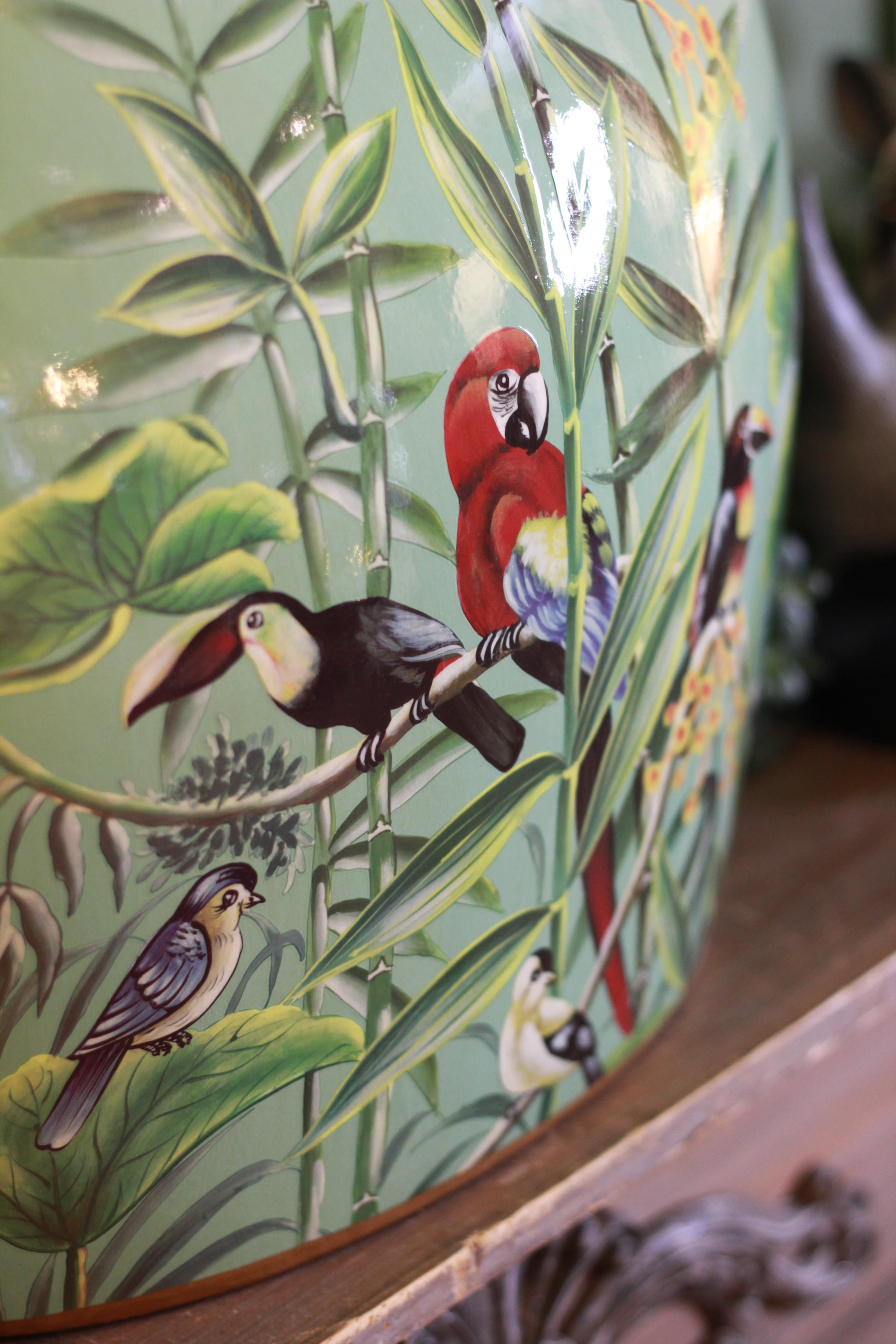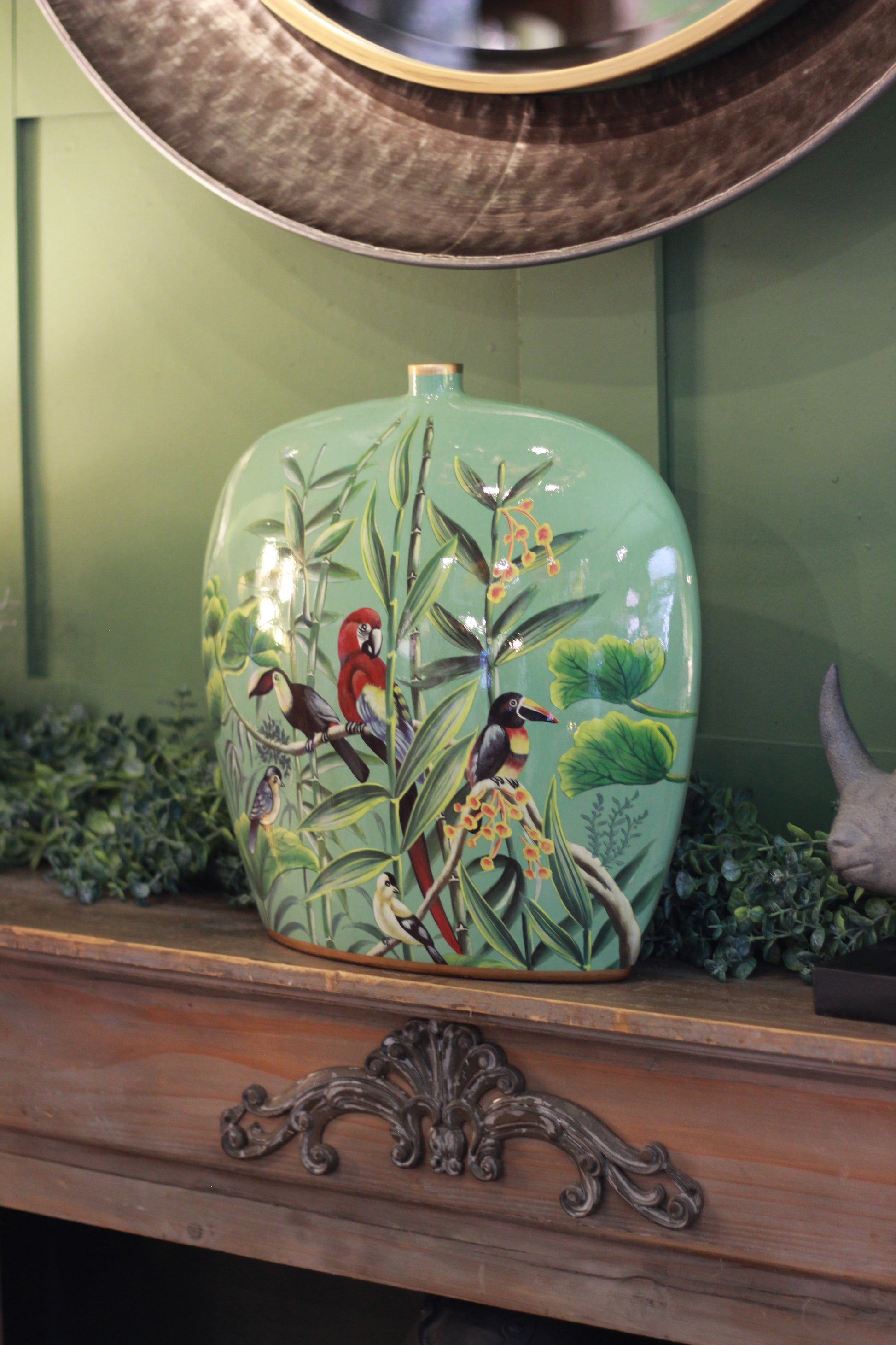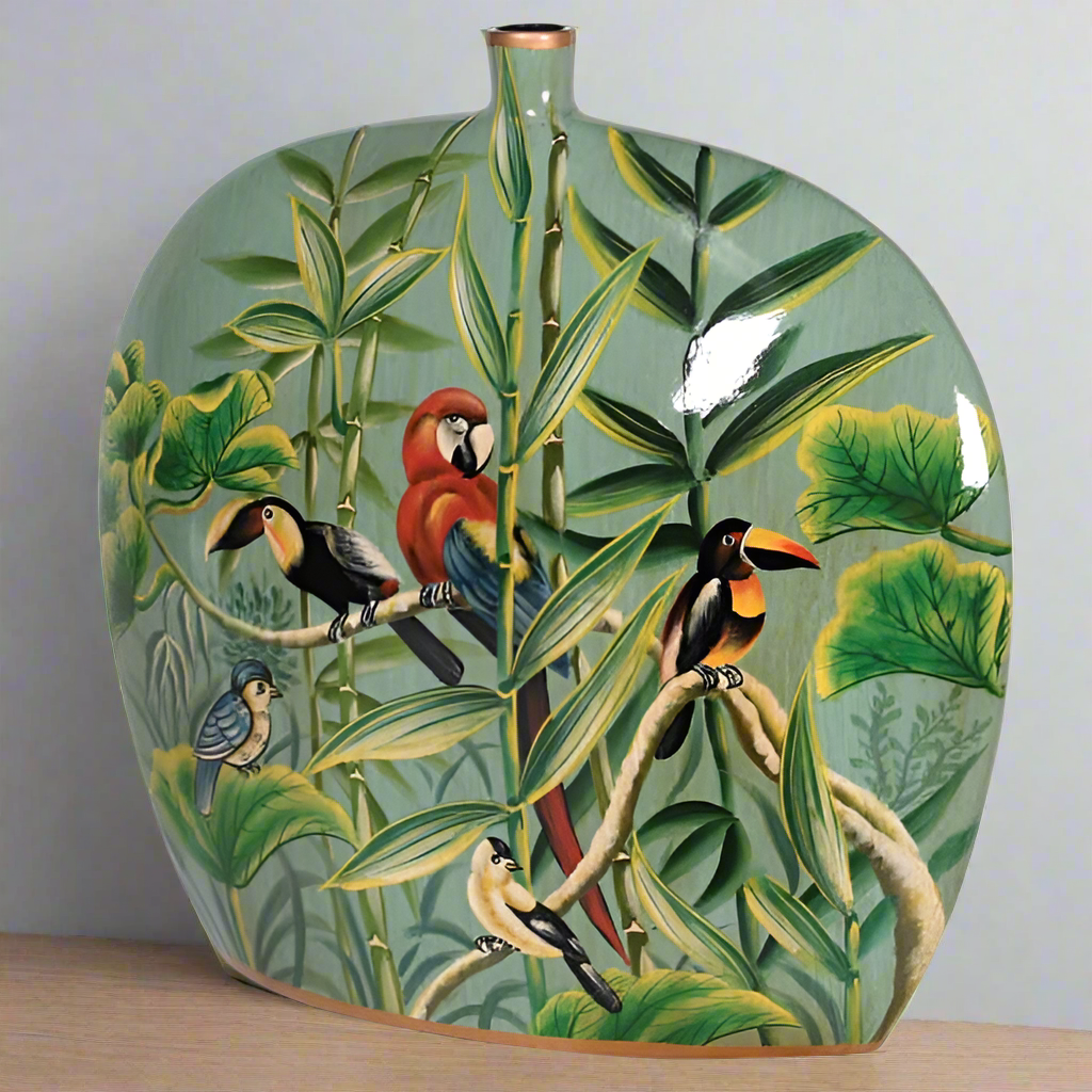 This amazing handcrafted vase showcases lively tropical birds in the jungle, adding a playful touch to any space in your home.