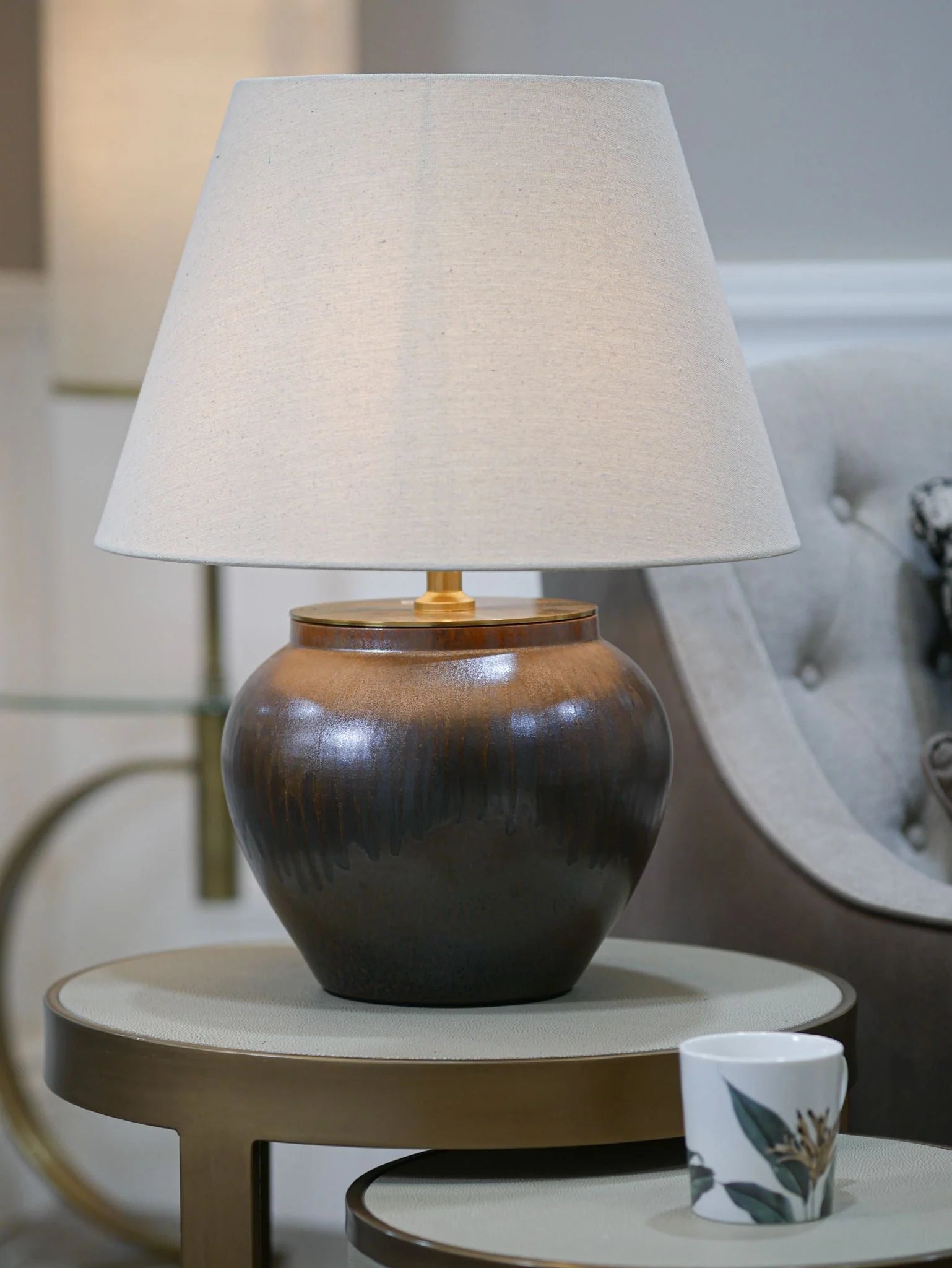 The rounded base is paired with a tapered linen shade and brushed brass detailing, creating a soft, ambient glow that works beautifully in living rooms, bedrooms, or hallways. Its timeless design makes it a versatile addition to both traditional and contemporary homes.
