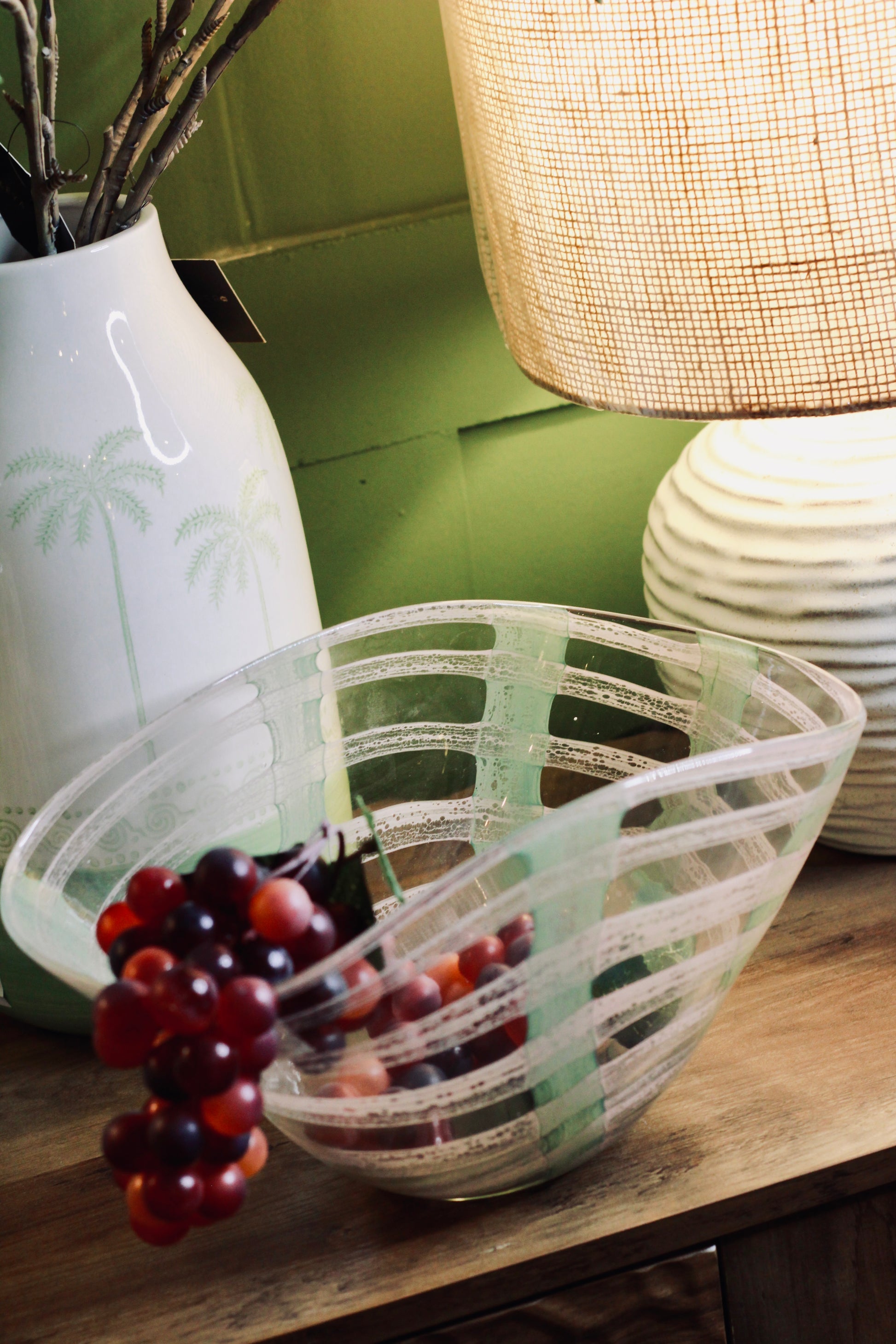A lovely decorative glass bowl with pink and green patten running throughout the glass. Brighten up your hone with this whimsical glass bowl adorned with a playful pink and pistachio pattern.